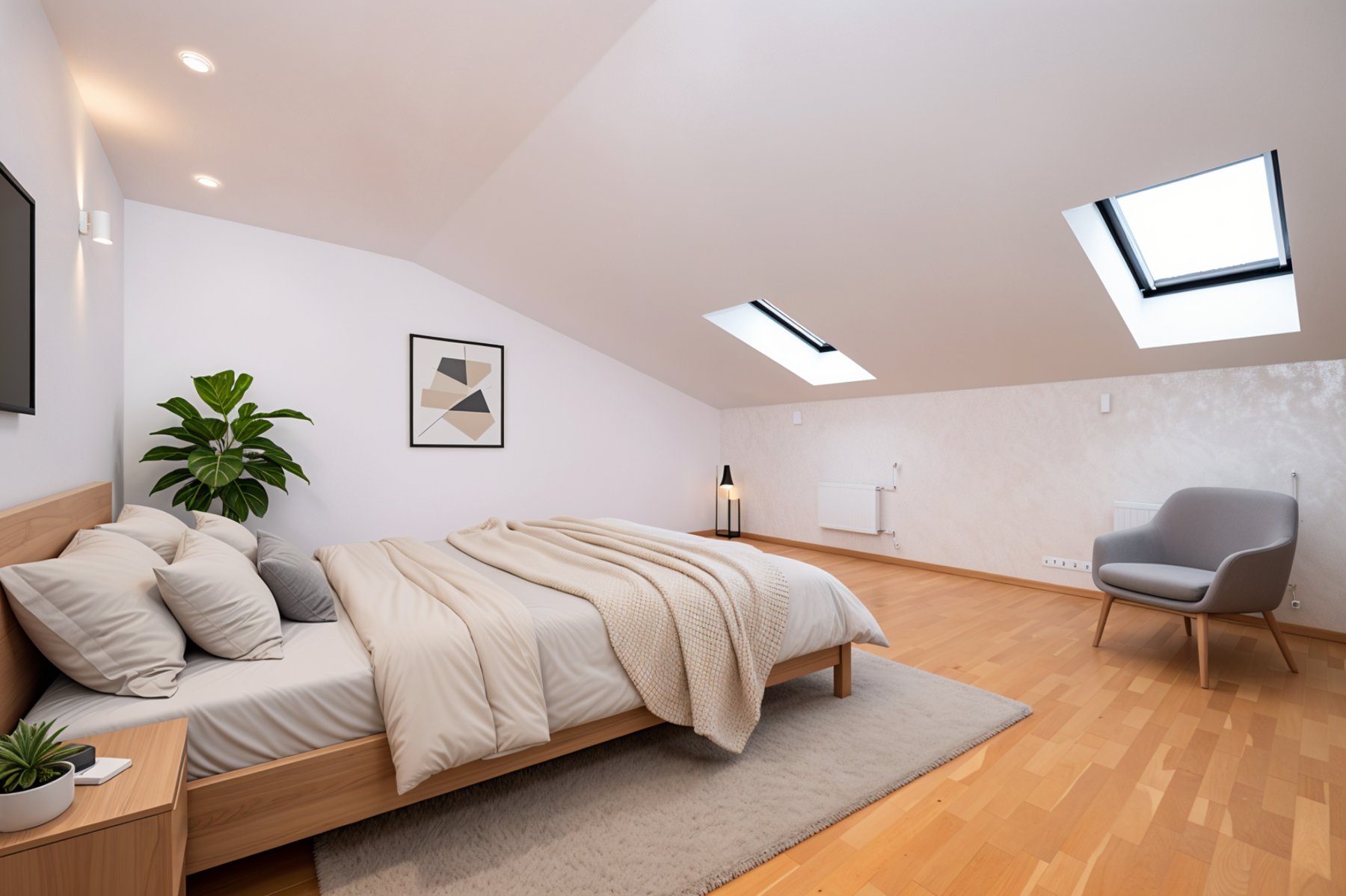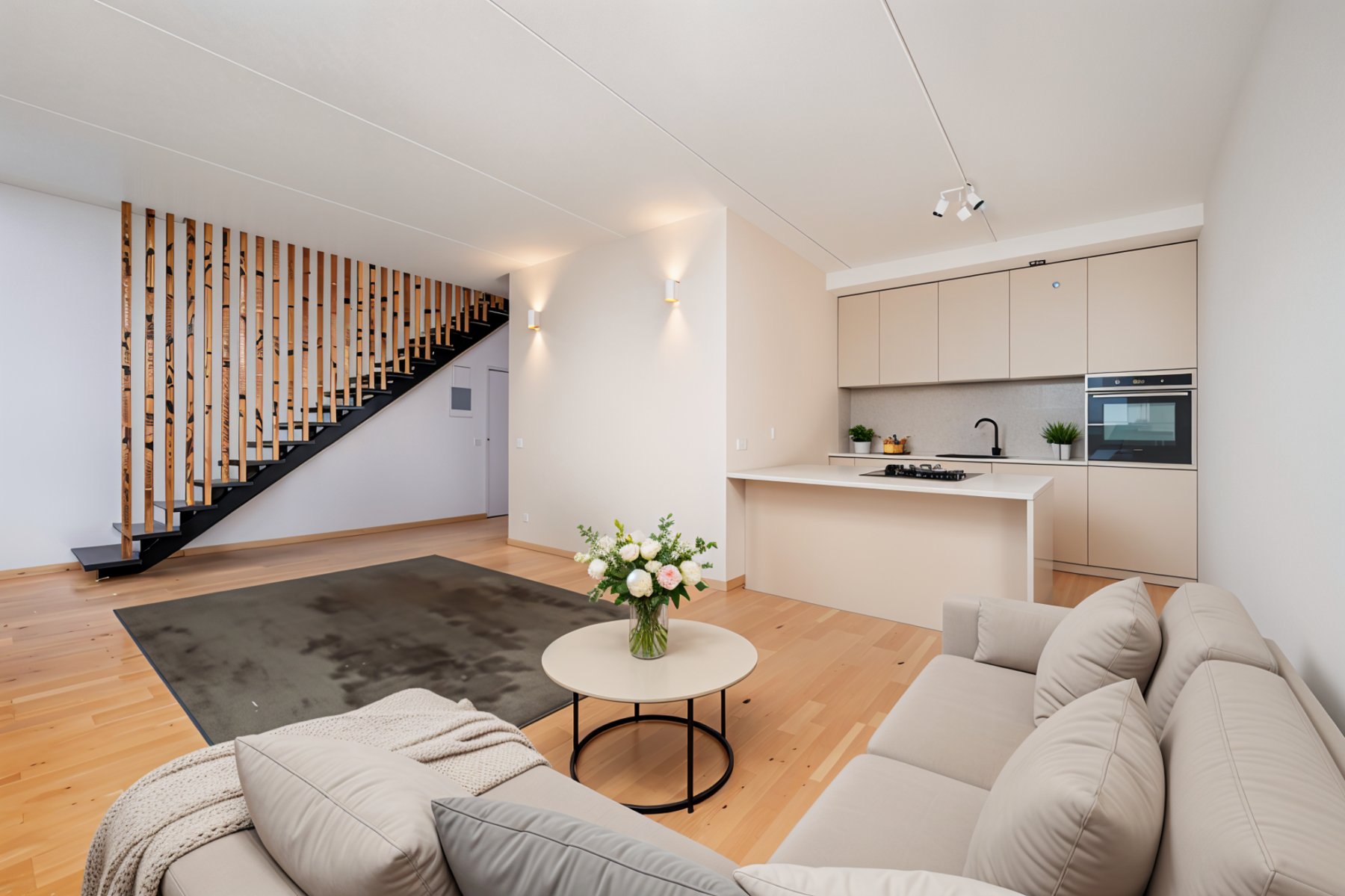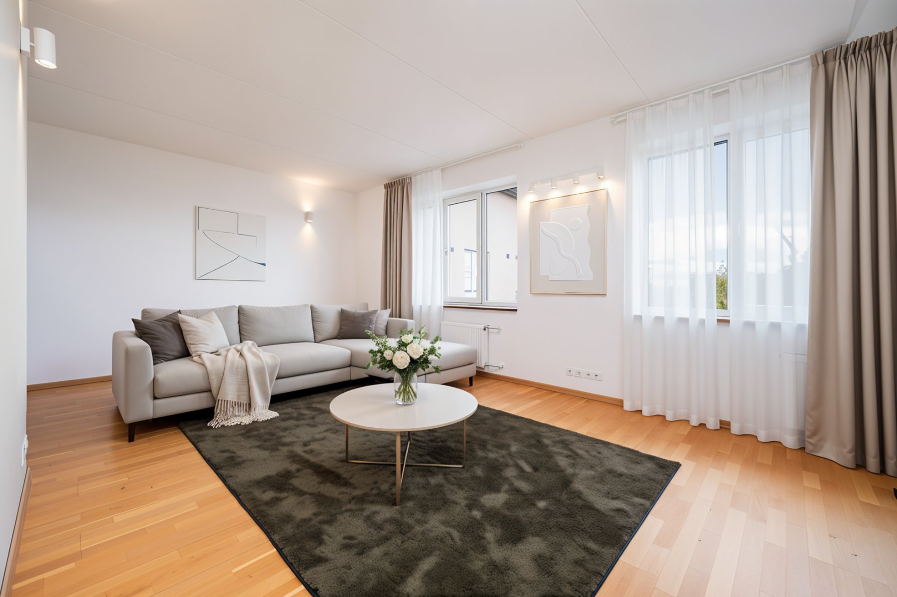 - Interjöör on heledates ja ajatus stiilis toonides, mis loob rahuliku ja hubase atmosfääri.